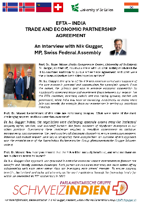 In particular, the India Competence Centre can rely on the expertise and experience of Mr. Nik Gugger, Member of Swiss National Parliament and the ‘father’ of the Free Trade Agreement between Switzerland (EFTA) and India. His reputation among high profile political and corporate leaders in both India and Switzerland combined with our "GANESHA - India Intelligence Platform" approach allows the India Competence Centre to provide unique access and insights about future developments and ongoing business opportunities.